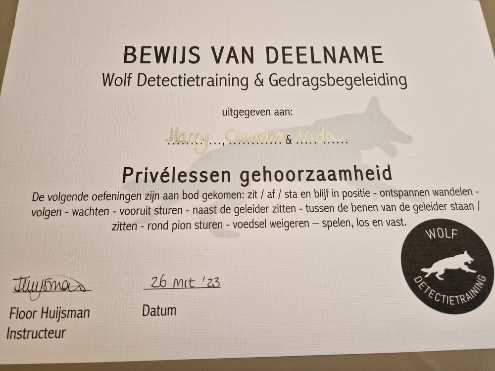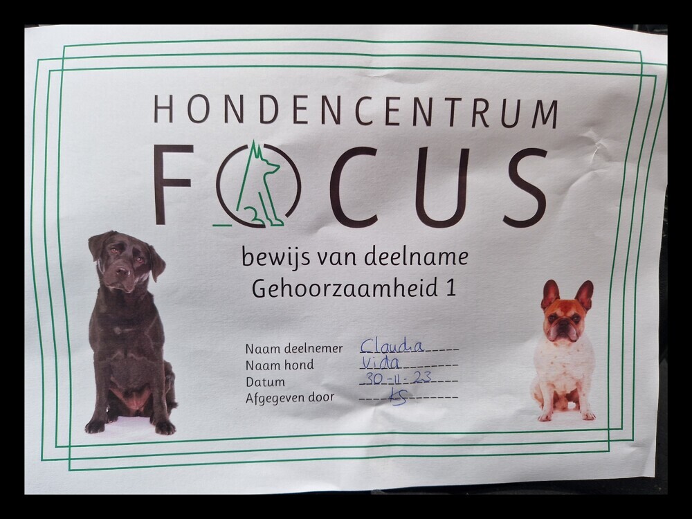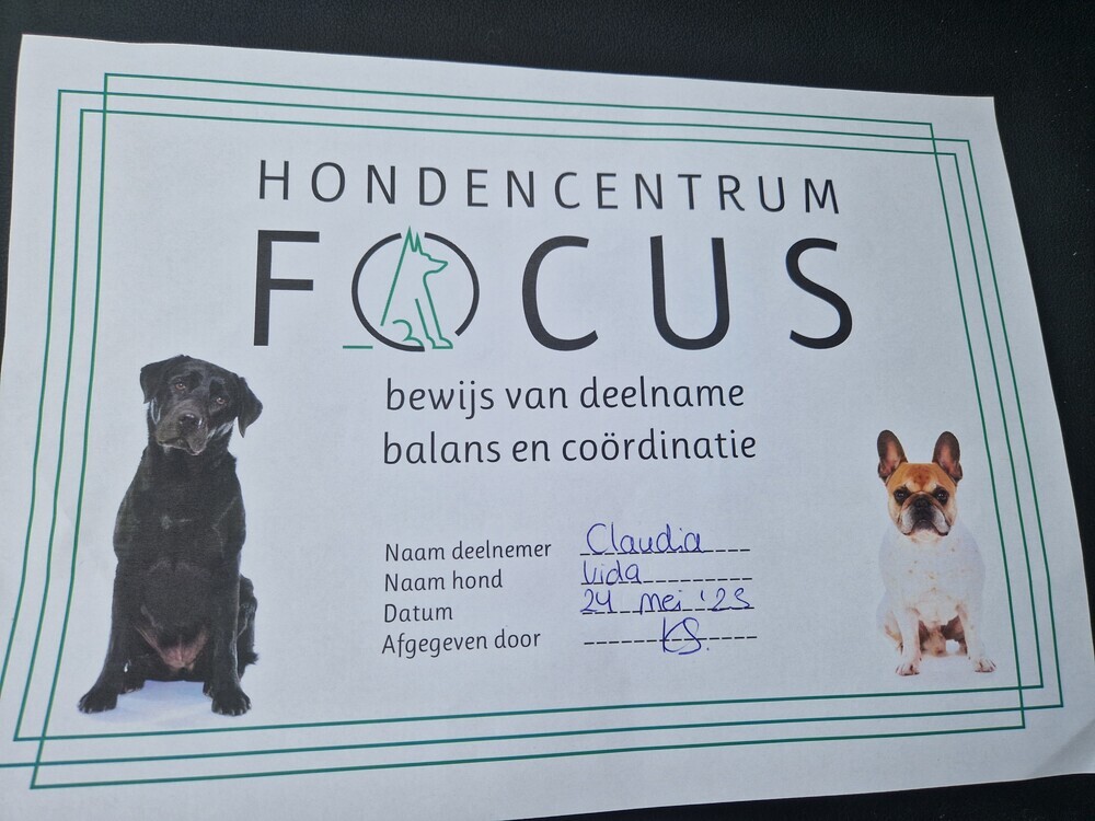 Vida heeft certificaat sportcurcus omdat Vida bepaalde onderdelen al goed kent vanuit gehoorzaamheid en we dus weer een stapje verder gaan met de hond, zo blijft het voor de hond ook uitdagend.