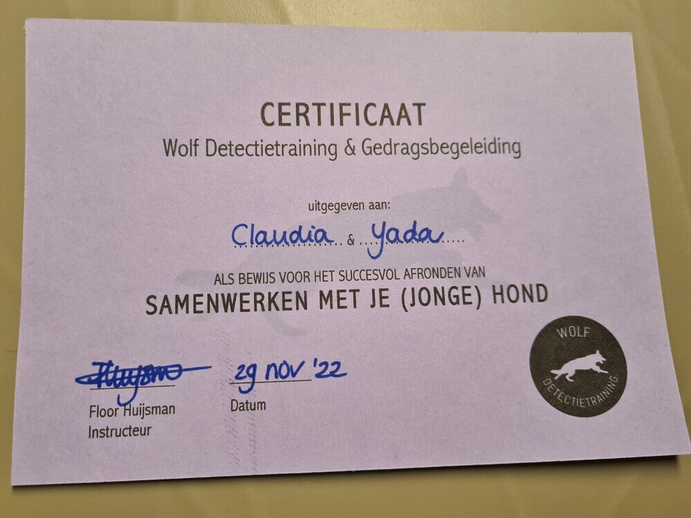 certificaat gehaald: cursus samenwerken met je (jonge) hond