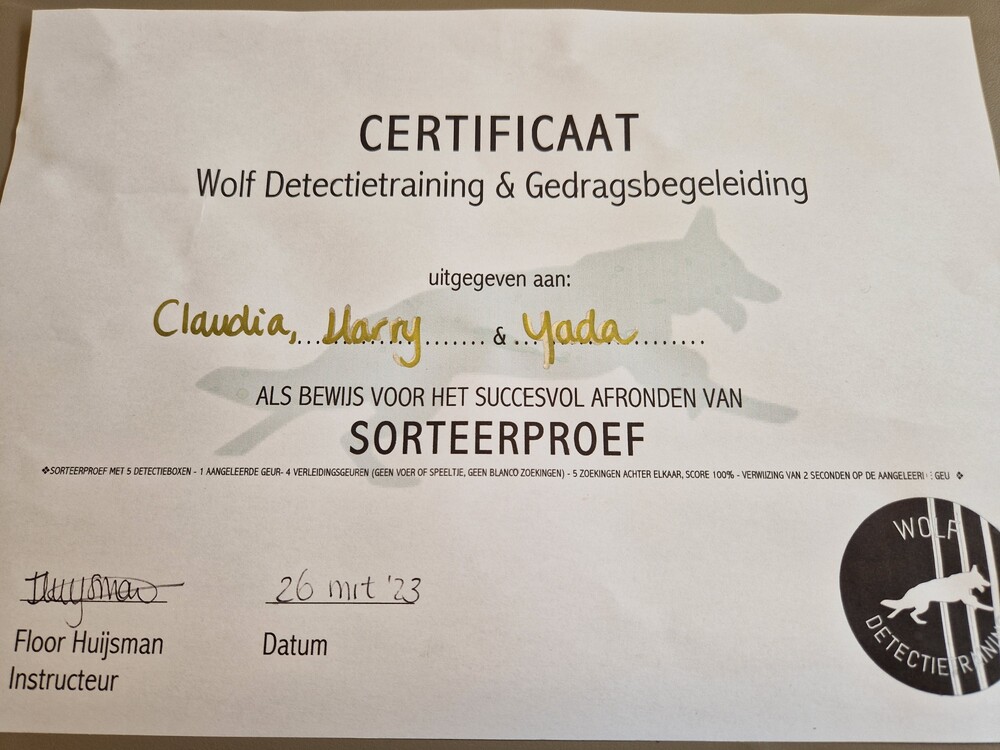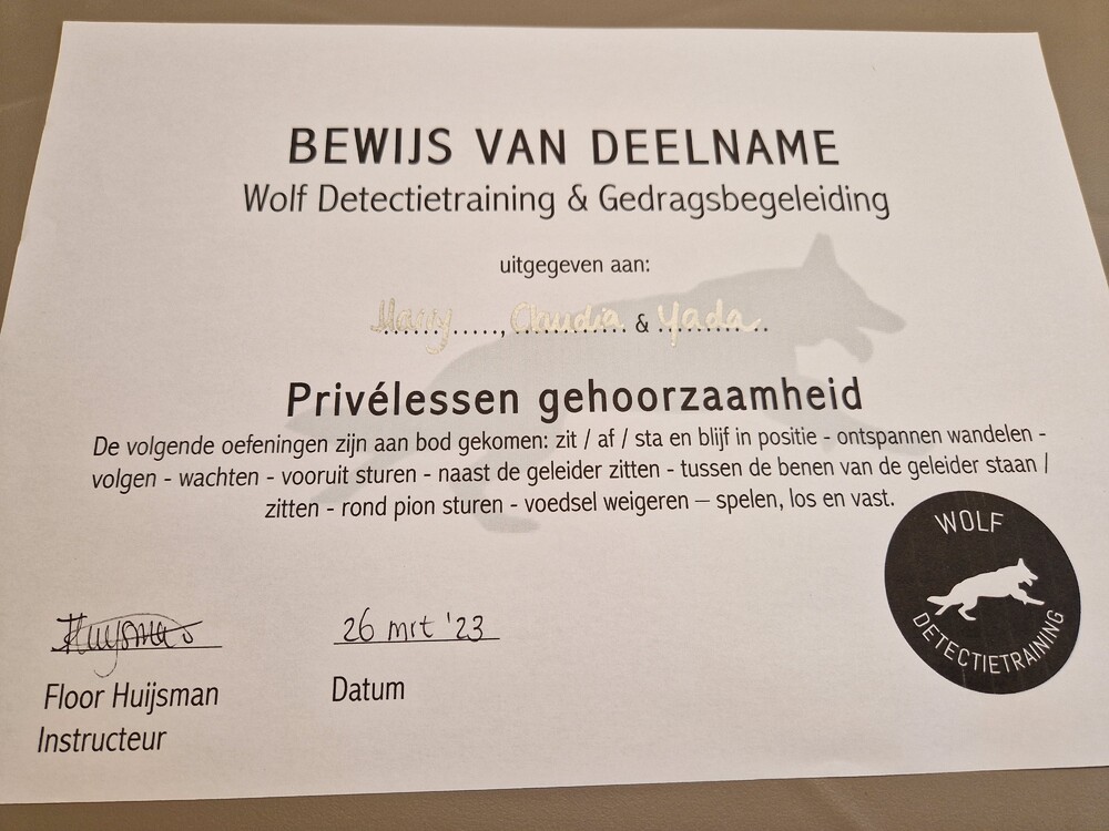 Daarnaast krijgt Yada bij beide hondenscholen detectie: begint 3 januari 2023 en eindigt 28 februari 2023, waar Yada ook de gehoorzaamheid 1 volgt.