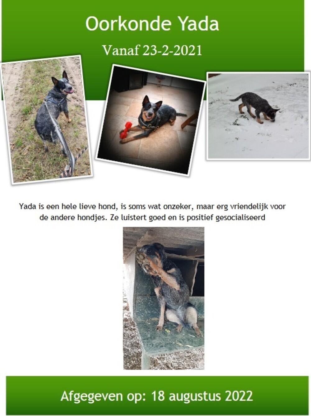Dinsdag 23 februari 2021 – Yada: Yada gaat naar dagopvang – einddatum: 28 november 2024 (vanwege loopsheid is deze einddatum anders dan bij Bucky: we richten ons meer op de honden trainingen, andere leermomenten)