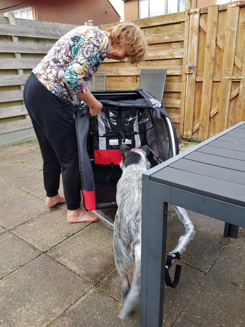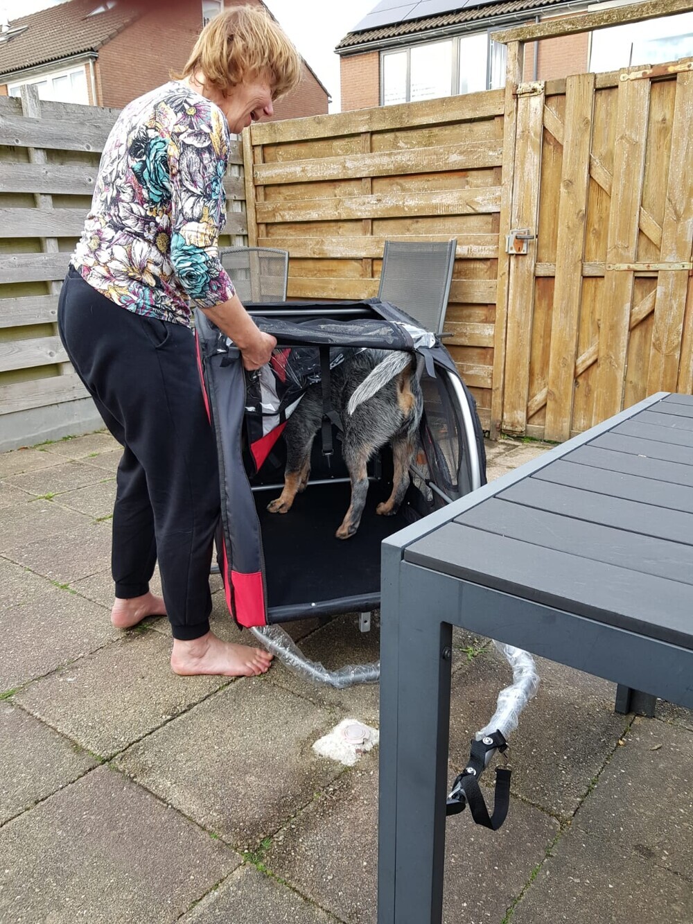 10 mei: Fietskar is gearriveerd terwijl het vrouwtje druk bezig is om hem in elkaar te zetten kijk ik alvast of die wel goed is.