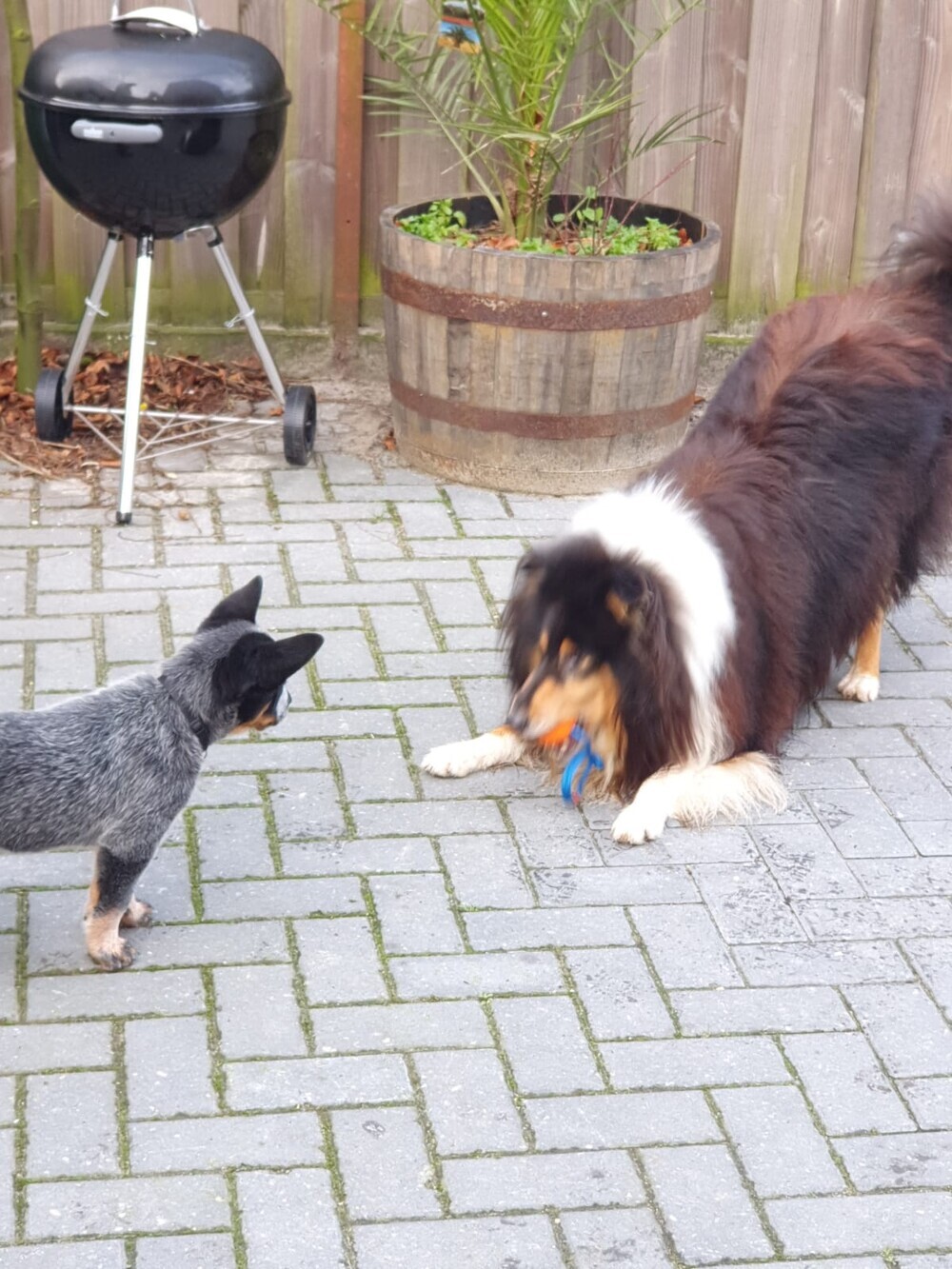 28 januari: hij leert heel snel, is al zindelijk, gaat al zitten bij een beloning, wacht als onze andere hond ook moet wachten, is verschrikkelijk energiek en heeeeeeel erg nieuwsgierig en ondeugend.