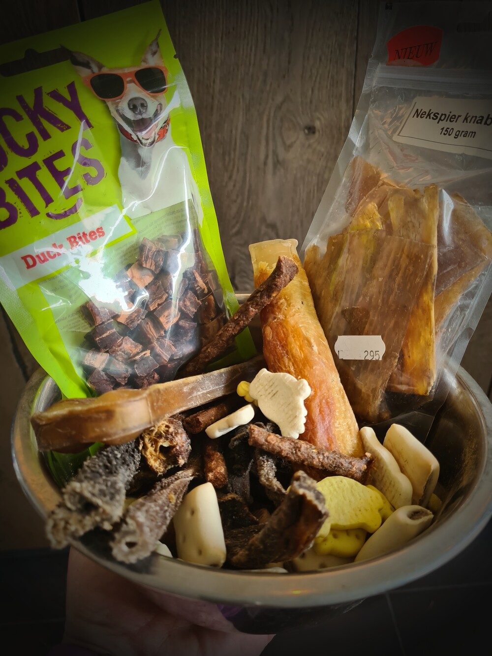 Tussendoortjes: pensstaaf, kauwkluiven etc. komkommer, banaan, blauwe bessen, appel, peer, ei, soms rauw, soms gekookt.