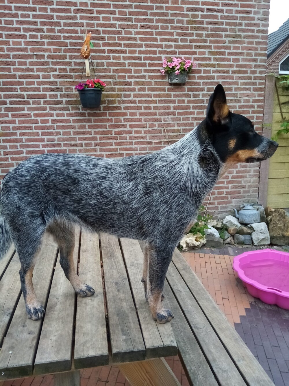 7 juni: Ze is heel druk met spelen met de andere hond. Bench rust is bijna onmogelijk, want het is een bom energie. Verder hebben we nog twee Springer spaniels, die zijn heel rustig, onderdanig en braaf. De oudere honden zijn wat rustiger. Onze Janske, is bijvoorbeeld 3 jaar oud. Het gaat heel fijn en goed in de roedel. Verder hebben we nog Dix en Driek en dat gaat ook goed. We hebben ook nog een rode cattle dog, die is naar de pup onderdanig toe. Graven in de tuin mogen ze hier gewoon. Ik hou van mijn honden en zorg goed voor ze, gisteren, vandaag en morgen.