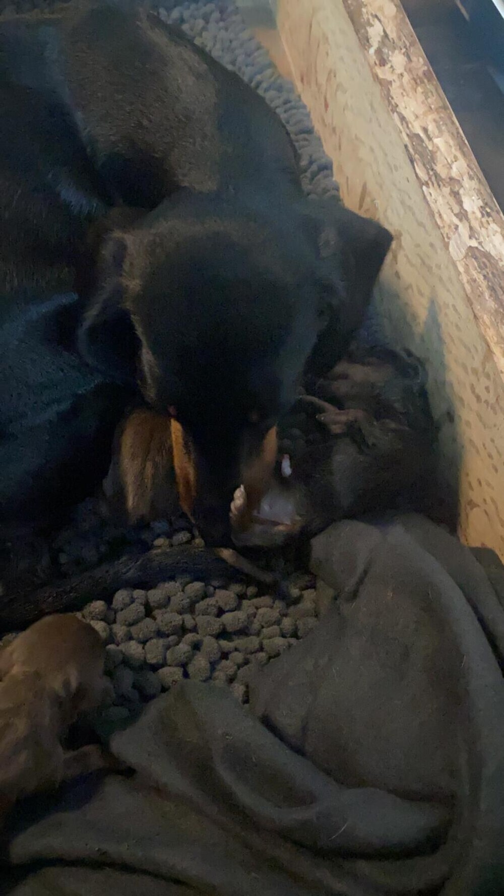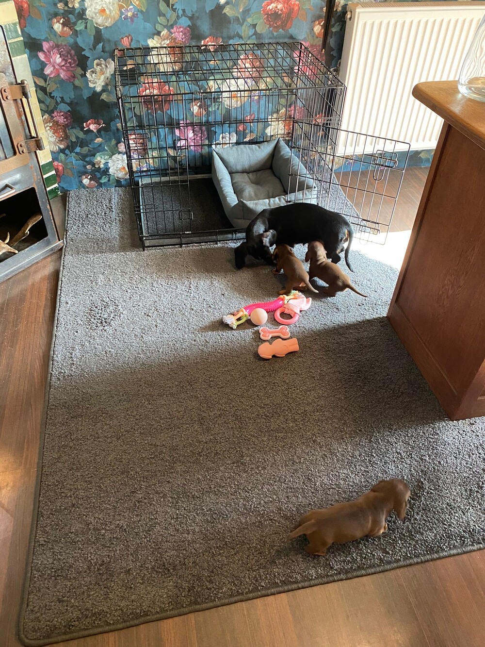 We zijn aan het zagen in emmen en de puppy's zijn bij oppas Niek. Ze vondt het niet leuk hoor, dit was even fijn: eruit te zijn. Om samen met haar in het veld te zijn, voor beide. Pups hebben het super goed gedaan. Ik heb net even alles gecontroleerd.