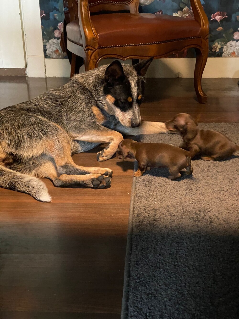 21 september: Voor de eerste keer uit de mand. Cato is buiten, die trekt dat niet, al dat gepiep. Fiep past op, is net even een betere mama. Abby vindt de pups helemaal geweldig! Ze is ook heel voorzichtig!