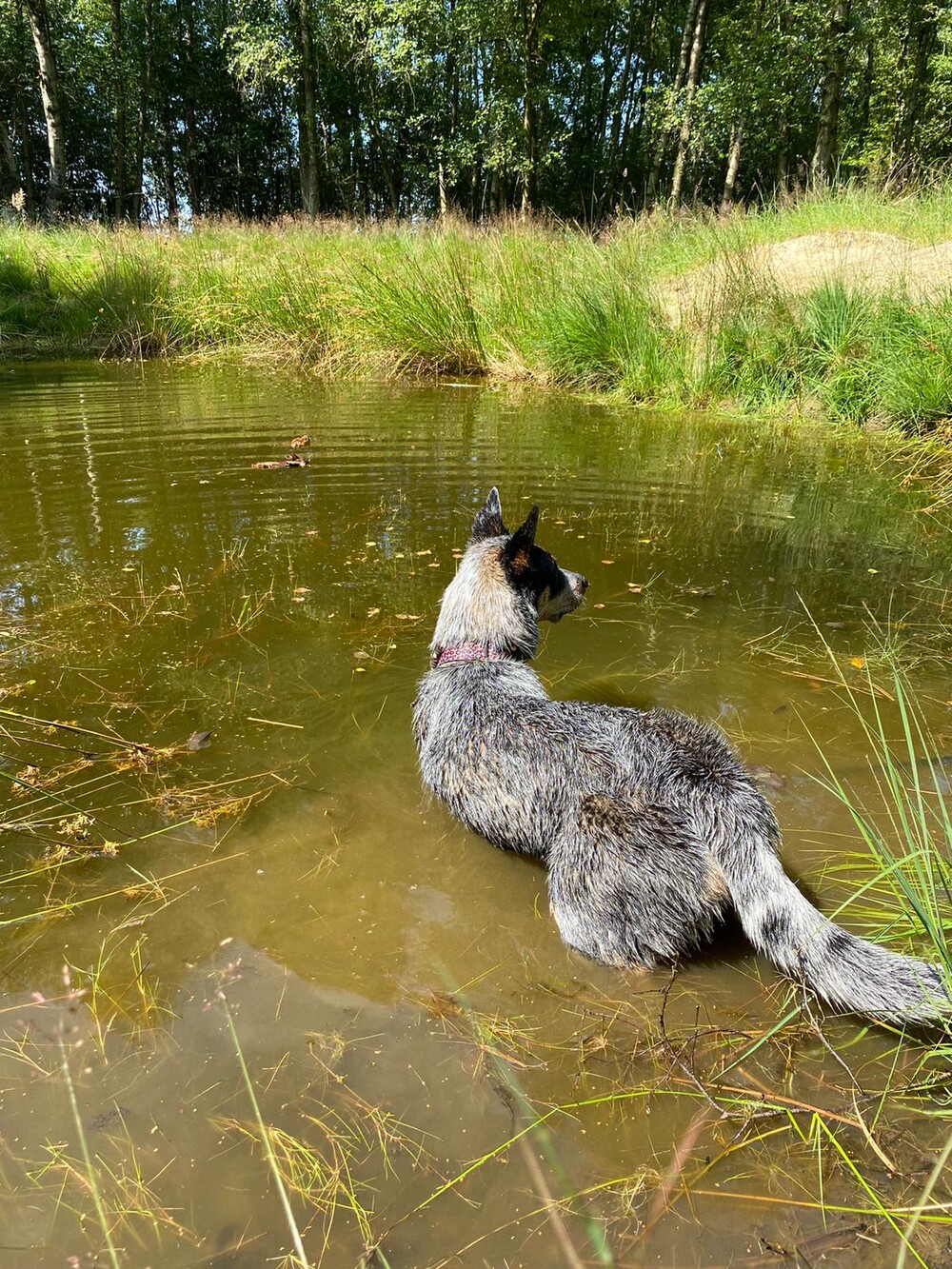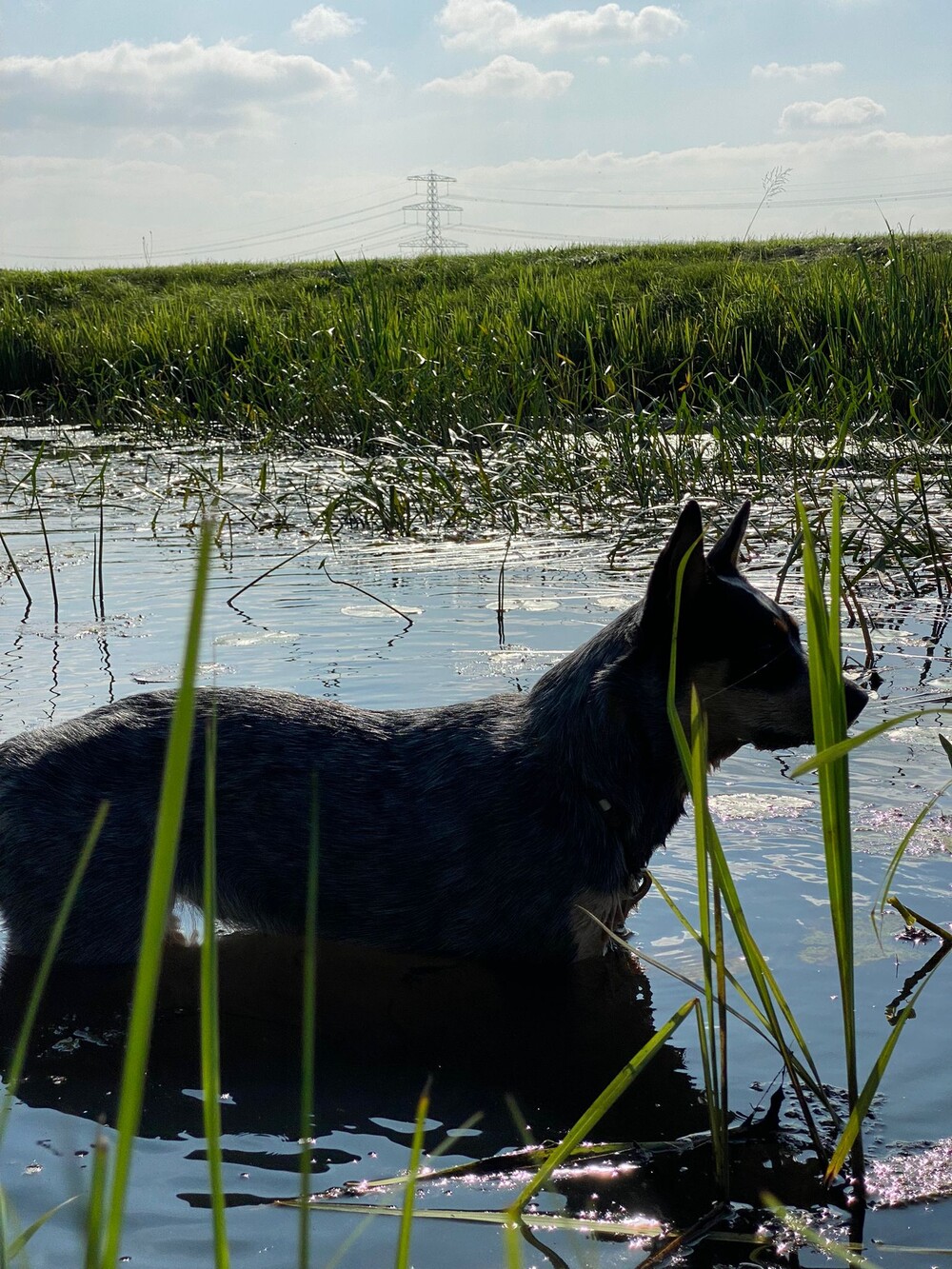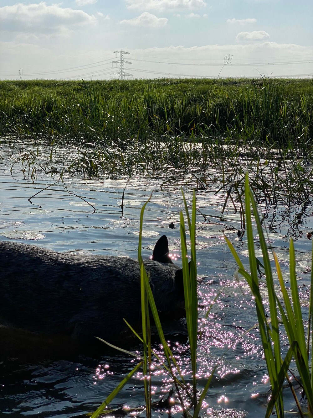 Madam hier gaat steeds zelfs zwemmen, of het nu helder water is in Almere of een prutsloot hier naast het huis.