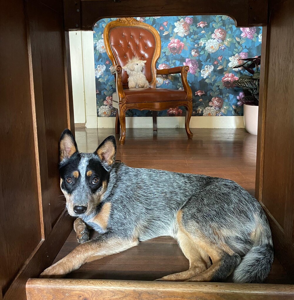 Abby heeft ook een bench, maar daar ligt ze alleen ''s nachts in. Overdag gaat ze waar ik ga. Ik heb overal manden staan voor Fiep en Cato, maar die zijn zo groot dat Abby er ook gemakkelijk in past. Maar doet ze gewoon niet. Of de stoel waar ik net zat, daar gaat ze ook op.