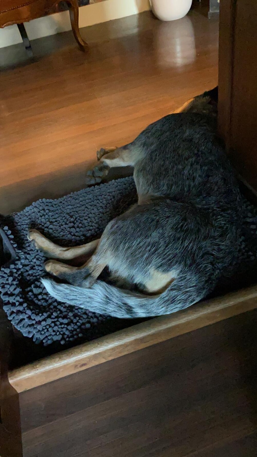 Ik had voor Duitsland precies zo'n kleedje gekocht voor in de badkamer. Maar die had ze al snel ingepikt. Ik heb voor hier ook maar eentje gehaald. Mand ligt ze eigenlijk niet in, ook al staan die er genoeg. Ze ligt het liefst dicht bij mij, liefs met tutteldoek. Maar die moet in de keuken blijven, anders sleept ze die overal heen, ook buiten. Ik heb deze voor mijn kamer gekocht. dan kan ze toch lekker liggen. Ook hier staat een mand, maar gaat ze ook niet in.