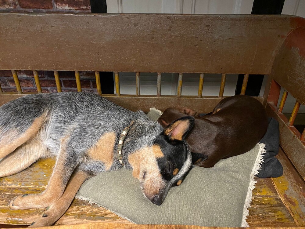 21 september: Voor de eerste keer uit de mand. Cato is buiten, die trekt dat niet, al dat gepiep. Fiep past op, is net even een betere mama. Abby vindt de pups helemaal geweldig! Ze is ook heel voorzichtig!