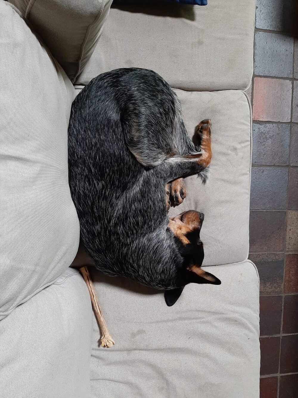 Hij ligt altijd bij me nu, ook in de keuken. Van de week stond hij ineens boven aan de trap, zo van, kom we gaan naar bed.