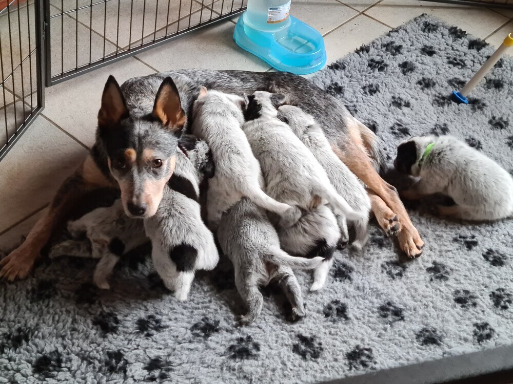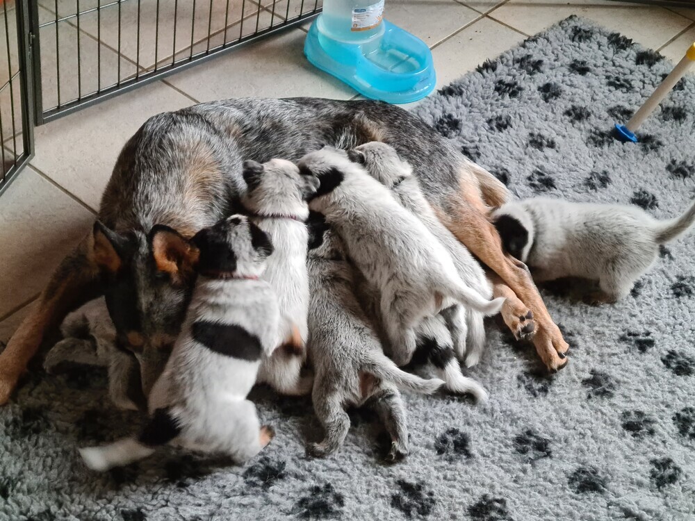 Hun karakter komt elke dag steeds meer naar voren, dus dat is mooi om te zien en om waar te nemen. Zover geeft het hier wel rust: moederhond doet goed mee met moedermelk geven en dat wordt nu minder, want de puppy's krijgen tandjes en dat is op dit moment goed aan het doorkomen. Verder heb ik wekenlang langs de werpkist geslapen, moederhond meegeholpen met de puppy's, zodat de hond rustig kon liggen en routine is toch anders, dus ze moest er ook regelmatig in de nacht eruit. Verder heb ik de hond meegeholpen door puppymelk te geven aan de puppy's en nu krijgen ze toch al volwaardige voeding in een prak vorm, verder zijn de puppy's nu speels en ontdekkend, dus ik heb elke keer wel een nieuw speeltje voor ze, of ik kom weer langs met de poetsdoek en de stofzuiger, dat vinden ze minder maar de reactie daarop is ook wisselend, soms durft de puppy het toch wel even op te nemen tegen de stofzuiger...als ze spelen met ekaar, dan zijn ze uitdagend tegen elkaar, ze kunnen ook goed klimmen als ze willen.