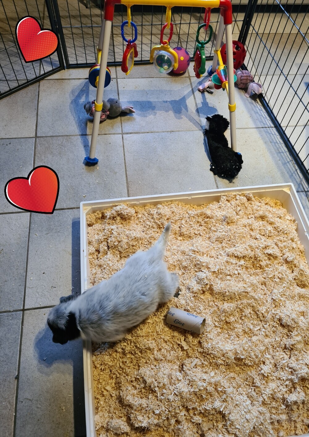 Om de socialisatie goed op gang te brengen, veranderen we de puppy ren in een "adventure box" denk aan: voorwerpen, die geluiden maken zodat, als het hondje er tegenaan loopt of er langs loopt: dat het geluid maakt, ook verschillende materialen, die ze kunnen gaan ontdekken: verschillende stoffen, nieuwe speeltjes, maar bijvoorbeeld ook een schot van verschillende hoogtes zodat ze een physische en mentale stimulatie krijgen.