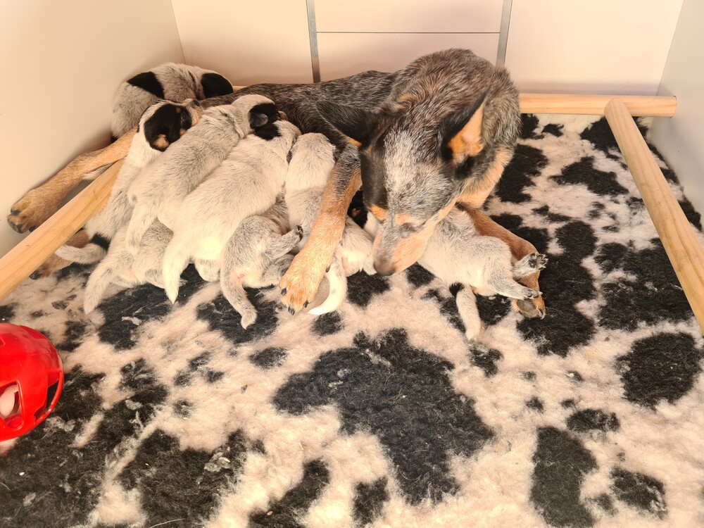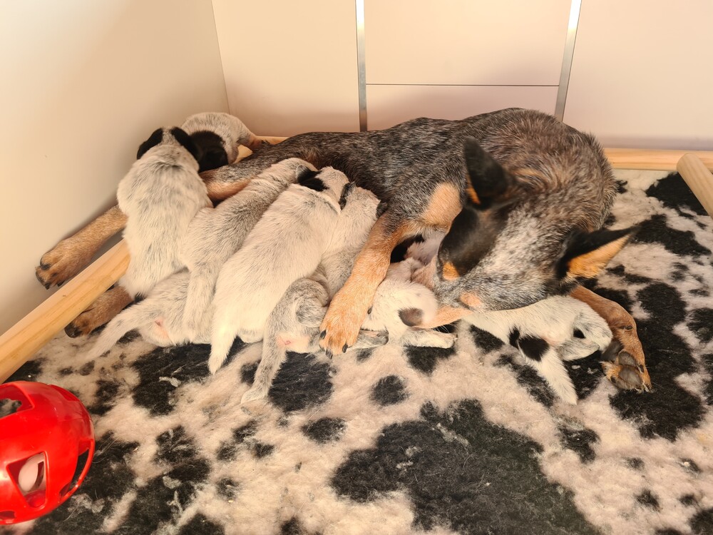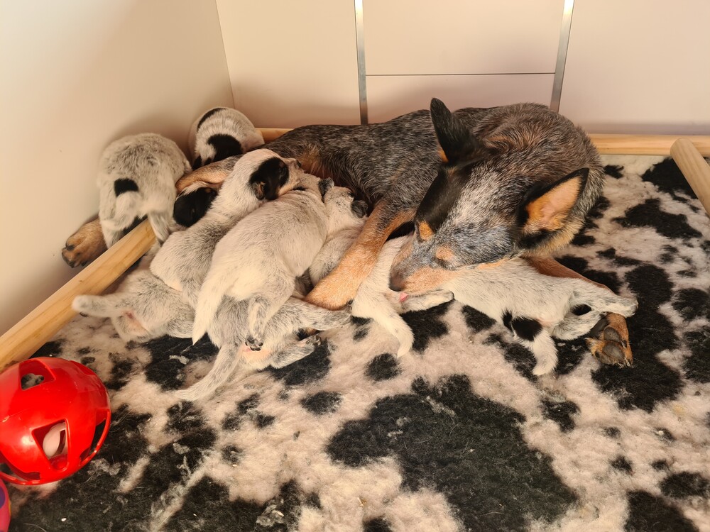 Vandaag kwam Dakota met haar hoofd in de werpkist, maar ze liep niet de werpkist in, dus haar puppy's kwamen naar haar toe, Dakota deelt likjes uit en de puppy's wilden naar hun moeder: dus "naar moeder gaan" is genoeg stimulatie dat de puppy's uit de werpkist gaan, dus toch maar even het schotje verhoogd van de werpkist. Nog even en dan mogen ze met z'n allen in de puppy ren.