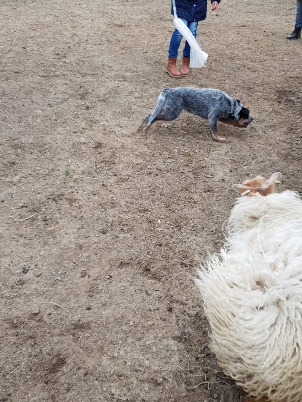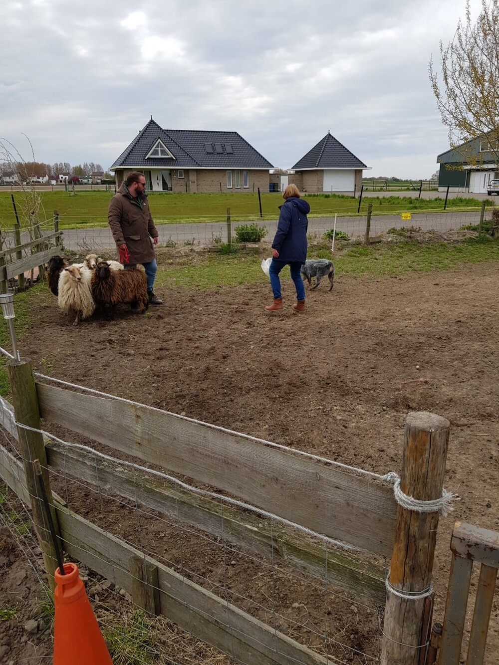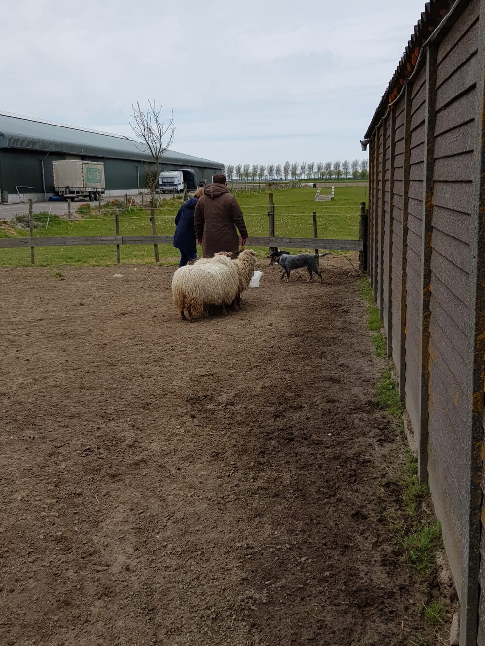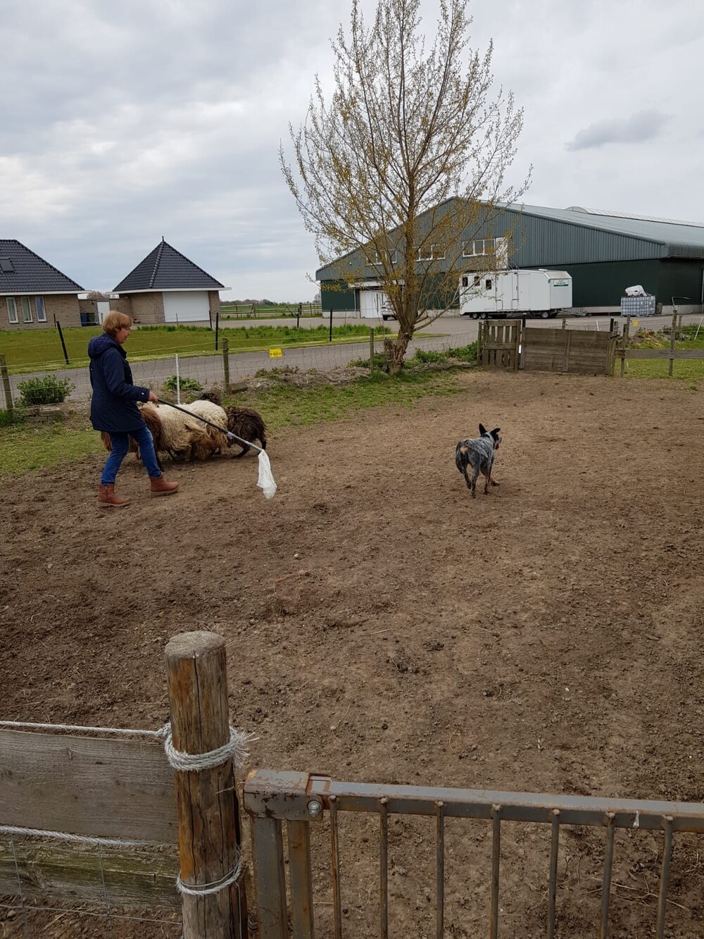 6 mei: Yvon eerste les als handler: moet ik nou op Ava Kira letten of op de schapen: het valt niet mee, maar het is erg leuk. Het ging prima, zeker toen Kira plannen had om bij een schaap in de kont te bijten. Yvon greep goed in!
