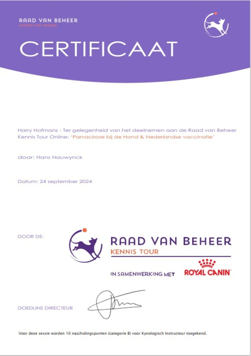 Raad van Beheer (NL) - Datum 24 sepember 2024 - Parvacirose bij de hond & nederlandse vaccinatie
