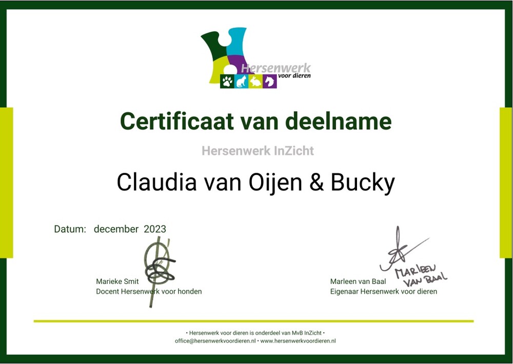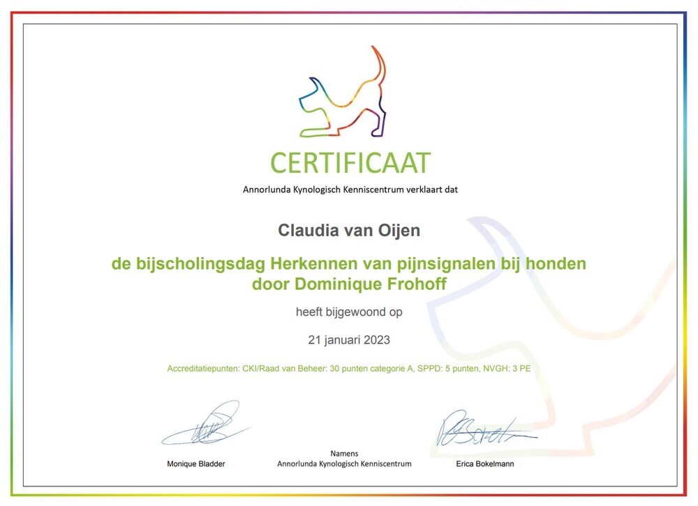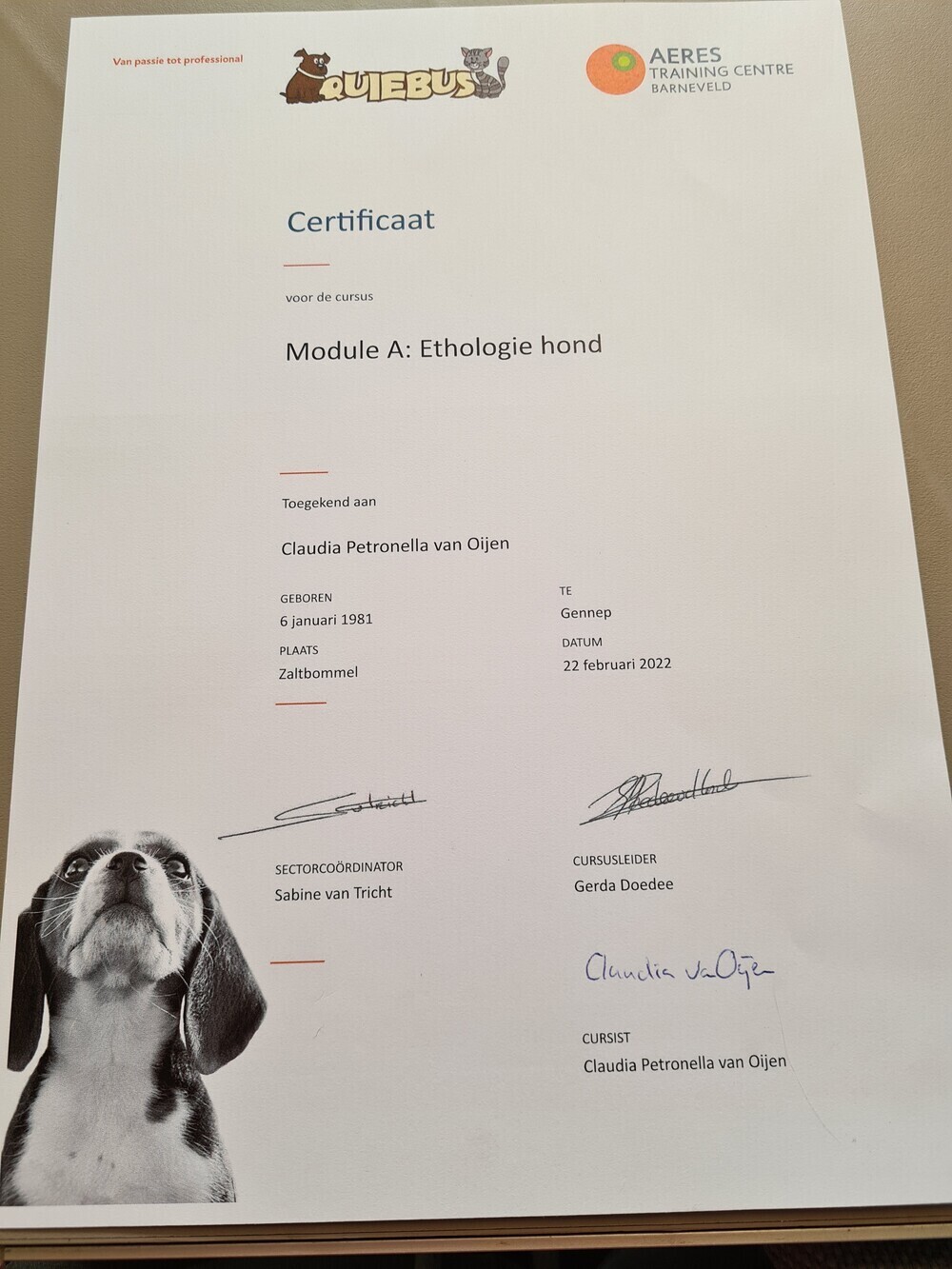 Kynologie module 1A Gedrag en leren: 2 december 2024: geslaagd met certificaat