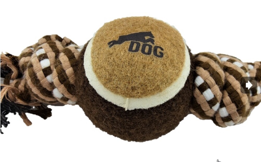 Dit hondenspeeltje is gemaakt van een sterk gevlochten katoenen touw en voorzien van een tennisbal.